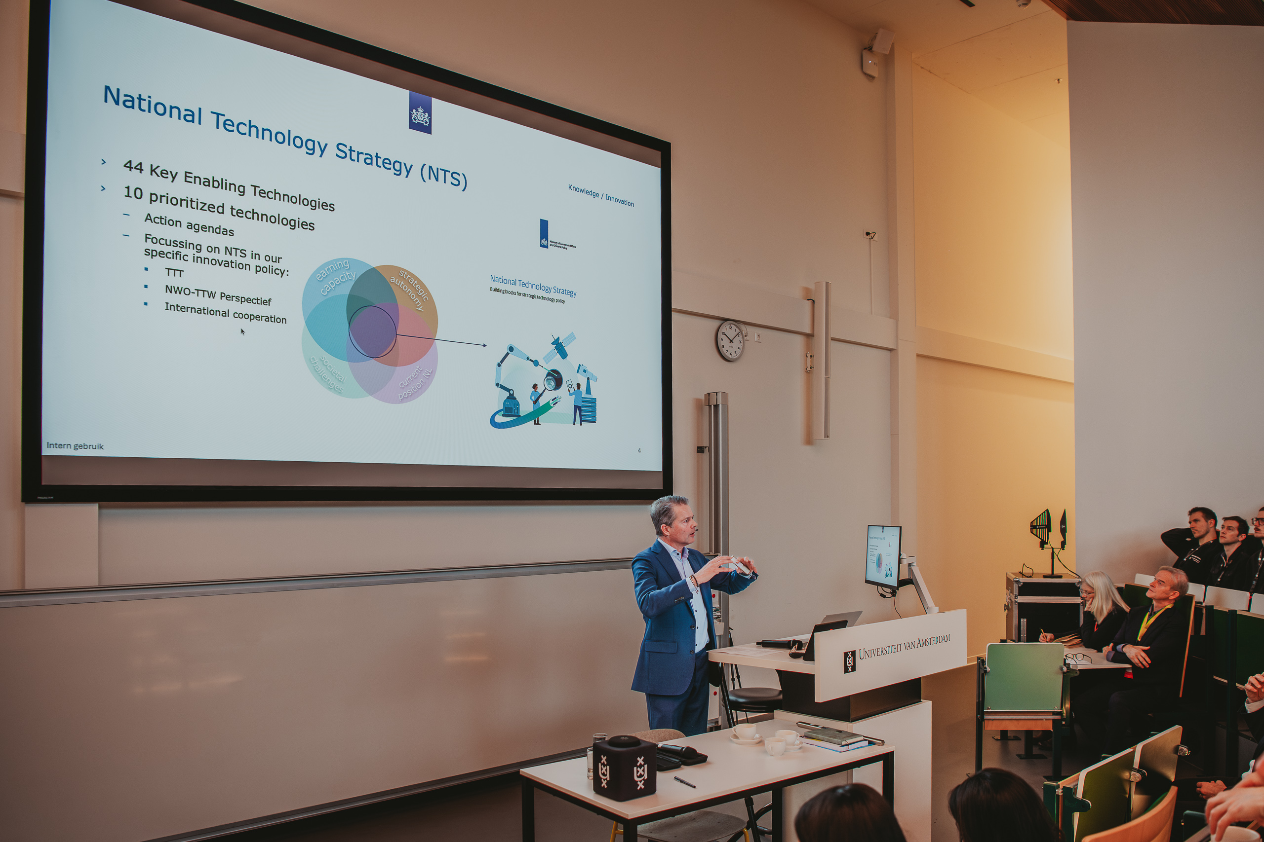 After an opening address by Susan te Pas, Dean of the UvA Faculty of Science, the plenary continued with a keynote by Tjerk Opmeer (director Innovation Policy, Ministry of Economic Affairs). He discussed the broader context of deep-tech research in the Netherlands and highlighted the National Technology Strategy (NTS).