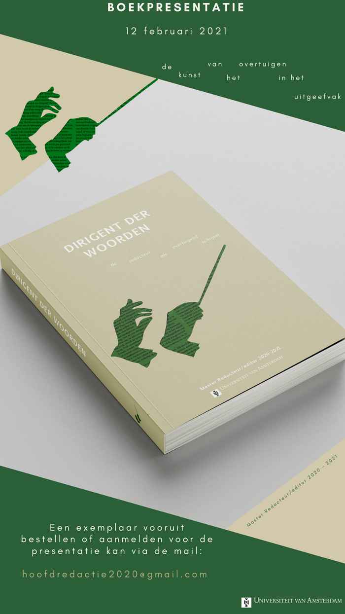Op vrijdagavond 12 februari is de feestelijke (online) boekpresentatie van Dirigent der woorden. Vanaf 13 februari is de bundel verkrijgbaar bij Athenaeum Boekhandel in Amsterdam. Aanmelden voor de boekpresentatie of een exemplaar vooruit bestellen kan hier.